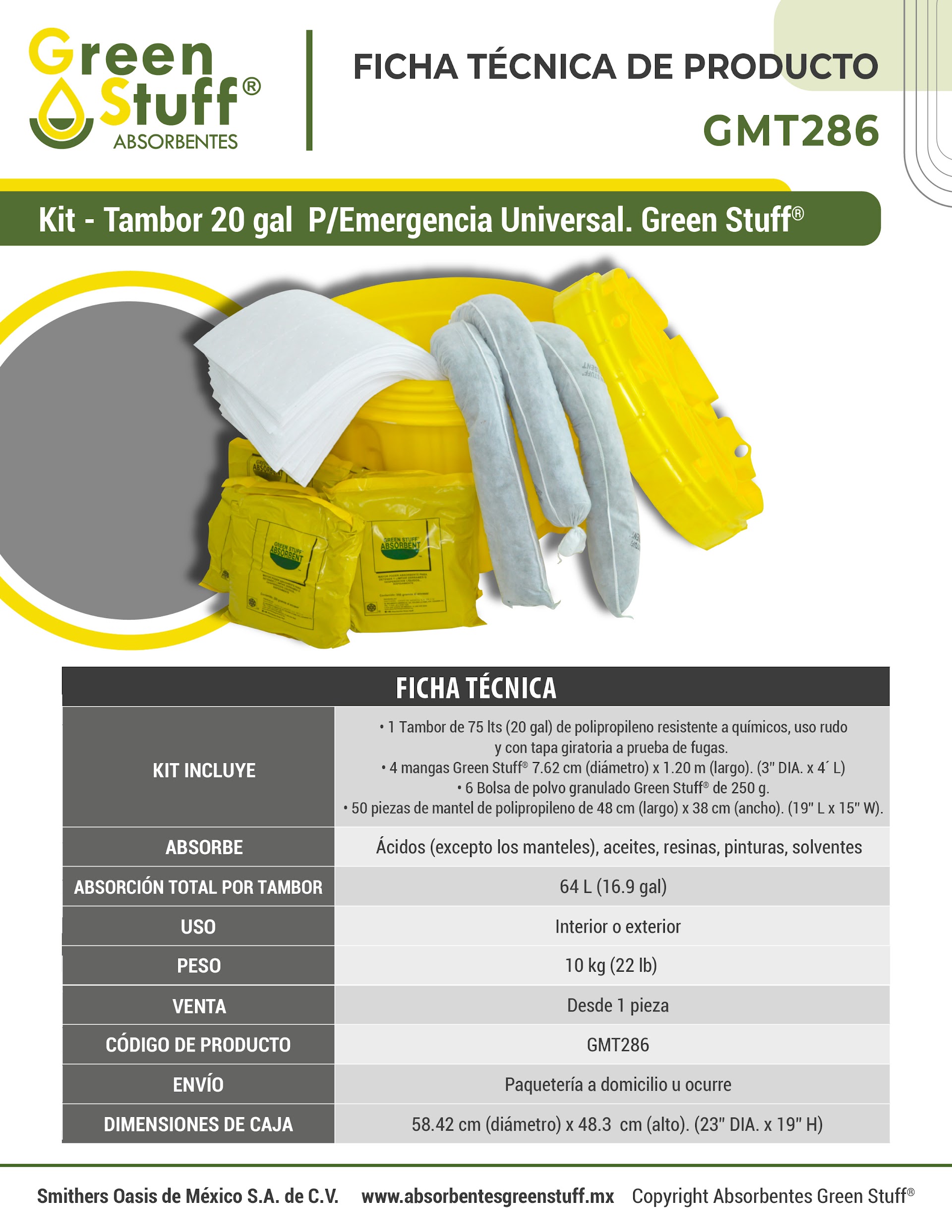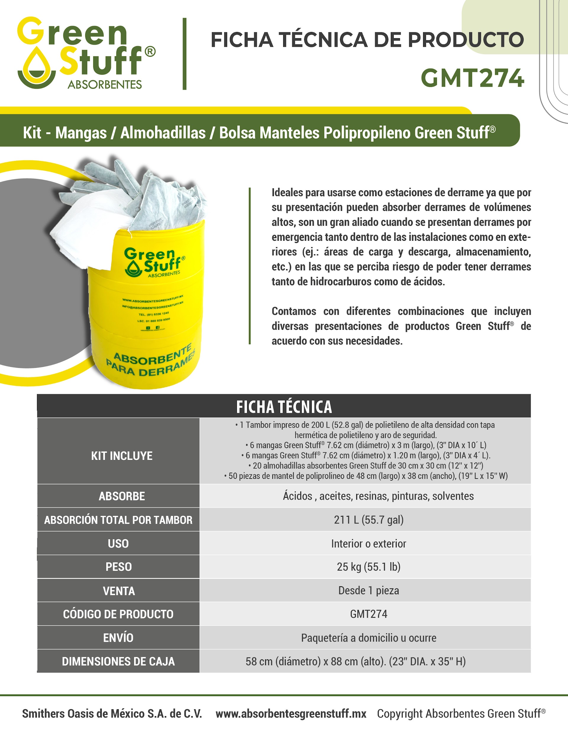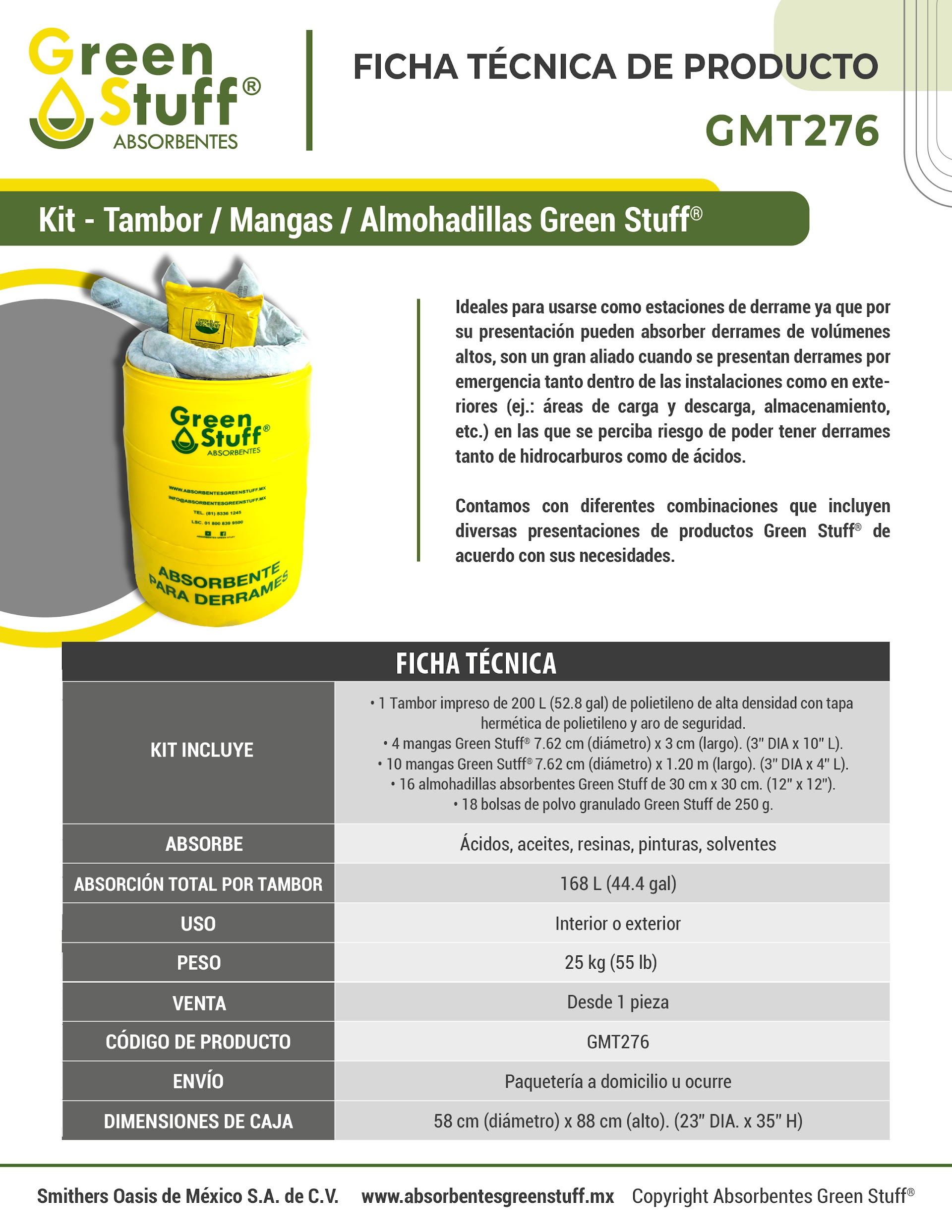 Las estaciones de derrame absorbentes GREEN STUFF® empacados en un kit de tambor listos para cualquier emergencia,son ideales para usarse como estaciones de derrame ya que por su presentación puede absorber derrames de volúmenes altos.